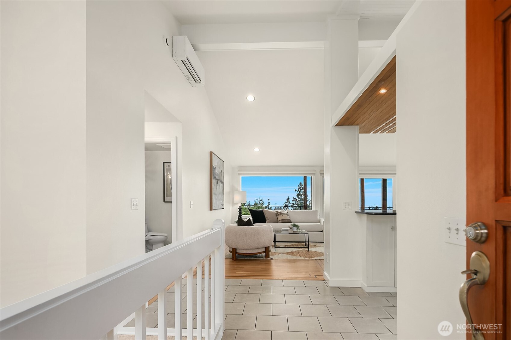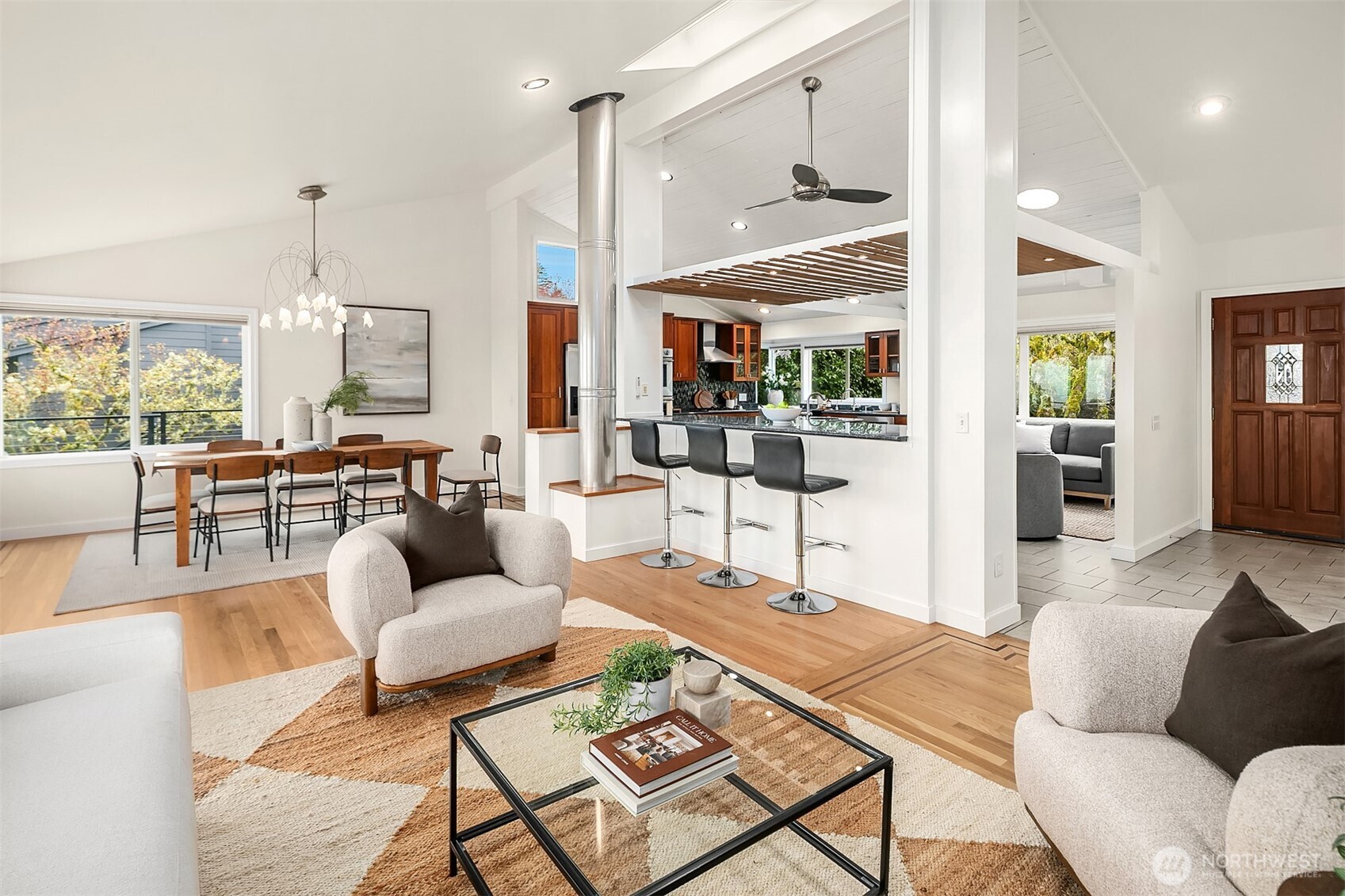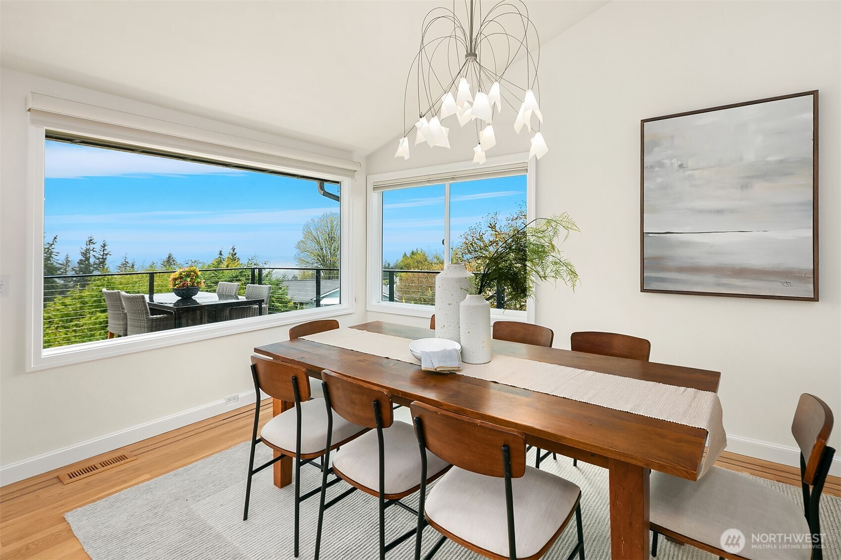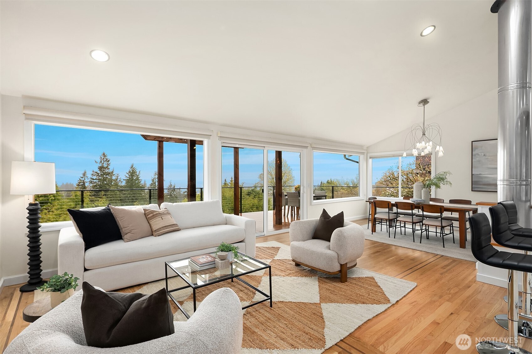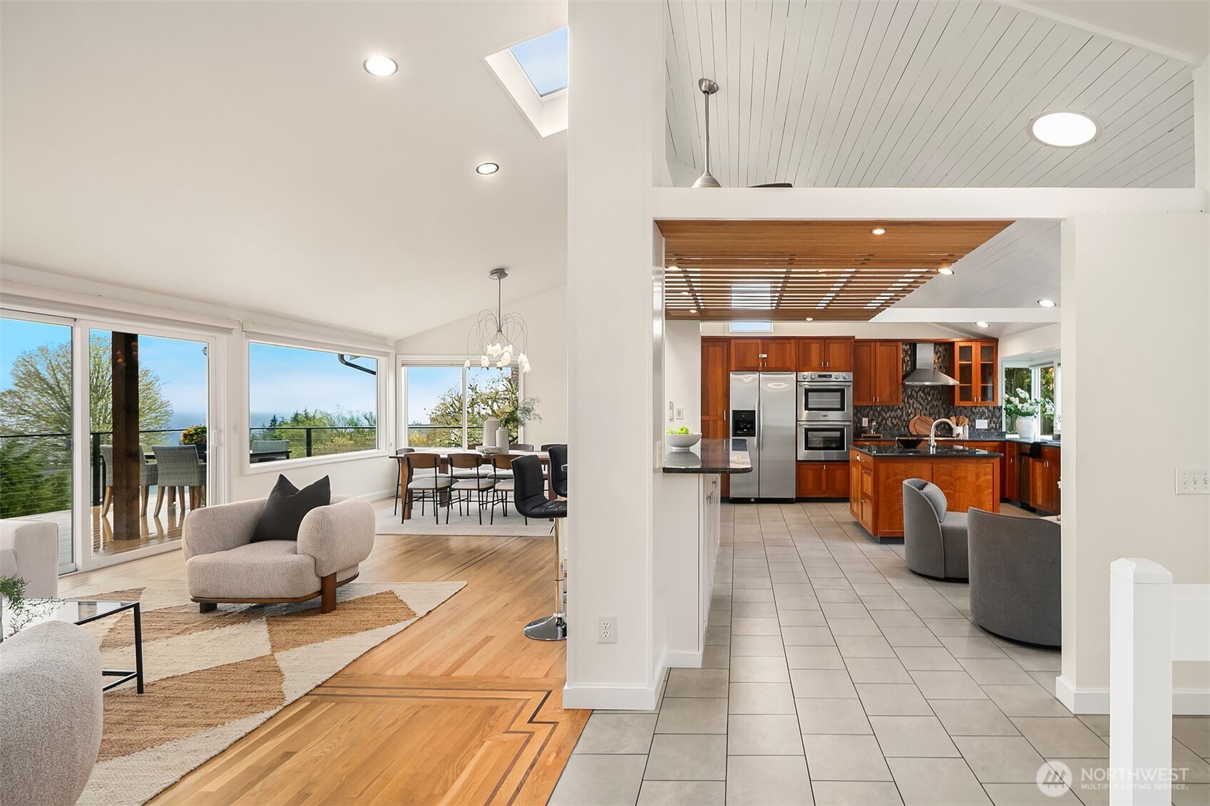 Welcome to your dream home in Horizon Crest, where views and serenity meet. This stunning mid-century residence offers expansive west-facing views of the city, mountains and the Puget Sound from the generous living room. You'll delight in the seamless flow from the kitchen to the dining and living areas. The home is ideal for entertaining with vaulted ceilings and open spaces. The new Trex deck connects via sliders to the living area offering a perfect spot to soak in the views. The home boasts a unique floor plan where your primary bedroom is on the main level, perched above the garden. It feels like a sanctuary with new carpets, fresh paint, and a refreshed en-suite bathroom and walk-in closet. The daylight lower level includes a spacious media room and three comfortable bedrooms. Upgrades include air conditioning and beautifully landscaped grounds featuring native plantings, turf, a retaining wall, and custom hardscaping. You're just in time for summer BBQs and al fresco dining season. Easy commuting locale with the new light rail station to boot! Don't miss this one!
