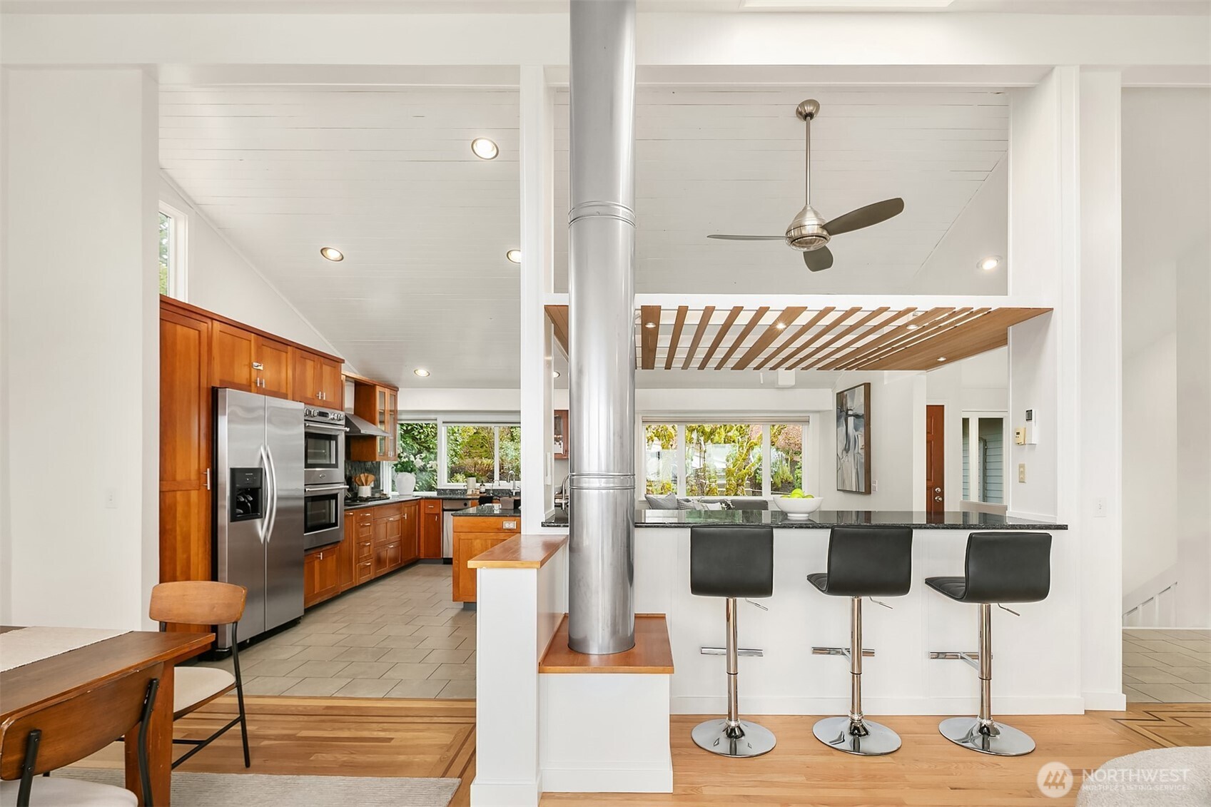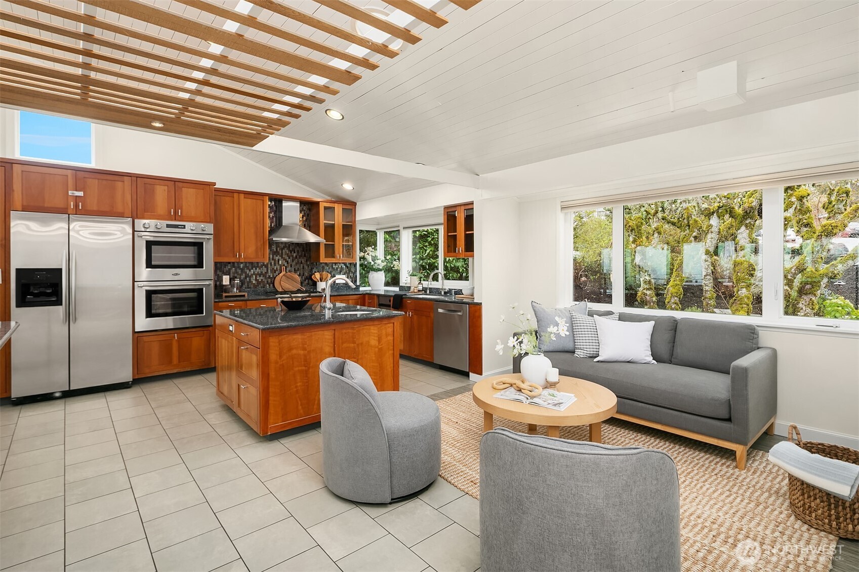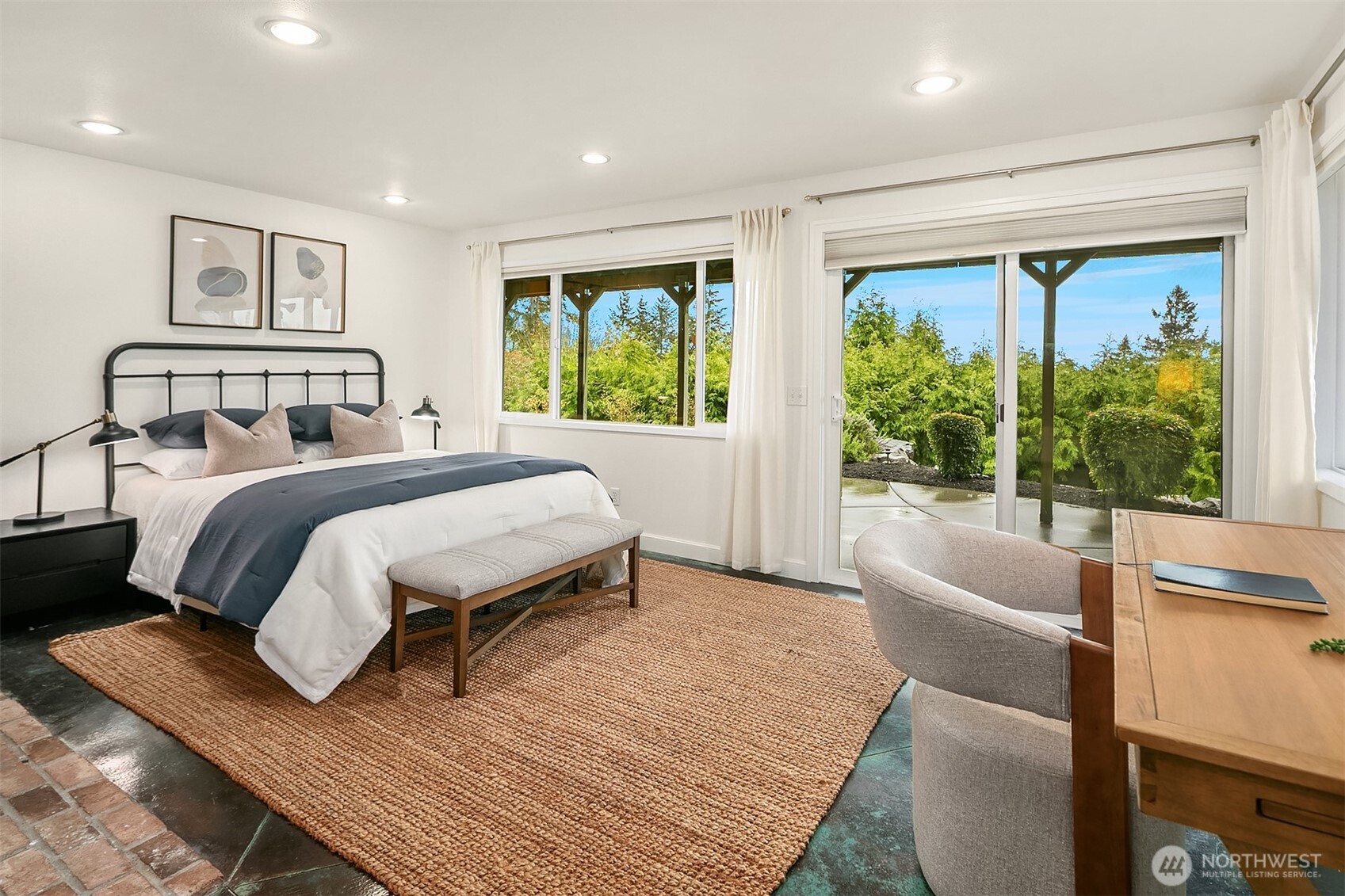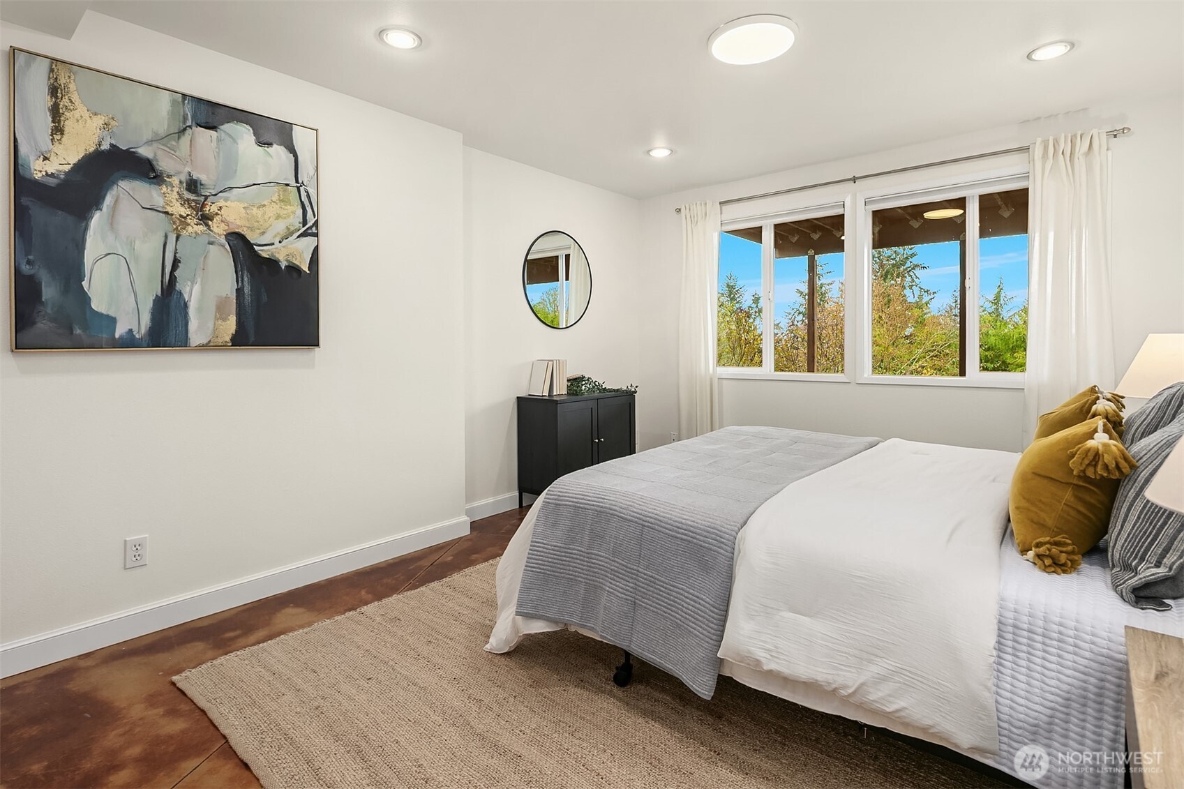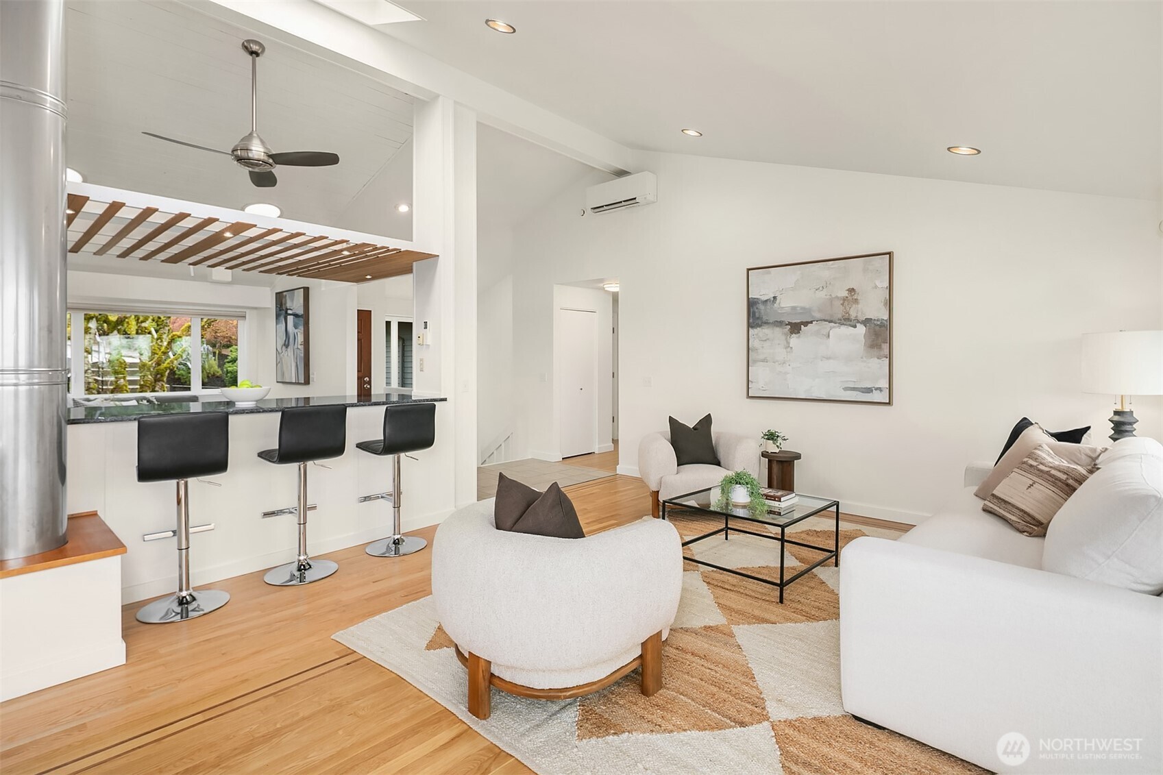 Welcome to your dream home in Horizon Crest, where views and serenity meet. This stunning mid-century residence offers expansive west-facing views of the city, mountains and the Puget Sound from the generous living room. You'll delight in the seamless flow from the kitchen to the dining and living areas. The home is ideal for entertaining with vaulted ceilings and open spaces. The new Trex deck connects via sliders to the living area offering a perfect spot to soak in the views. The home boasts a unique floor plan where your primary bedroom is on the main level, perched above the garden. It feels like a sanctuary with new carpets, fresh paint, and a refreshed en-suite bathroom and walk-in closet. The daylight lower level includes a spacious media room and three comfortable bedrooms. Upgrades include air conditioning and beautifully landscaped grounds featuring native plantings, turf, a retaining wall, and custom hardscaping. You're just in time for summer BBQs and al fresco dining season. Easy commuting locale with the new light rail station to boot! Don't miss this one!